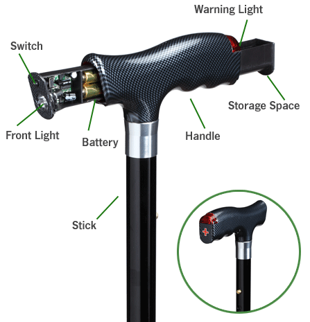 The storage space is inside the back of the handle for medicine, first-aid items, identification etc. |